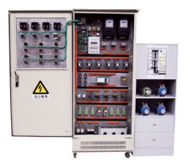 該裝置按標準電氣控制柜設計制造規格,充分利用雙面位置,柜內裝有完成各種照明電路所需的單相電度表、日光燈、單聯開關、插座、感應開關、漏電開關等,以及電氣控制所需要的多種低壓電器,如漏電斷路器、熔斷器、電流互感器、交流接觸器、時間繼電器、熱繼電器、中間繼電器、行程開關、按鈕、信號燈、轉換開關、電壓表、電流表、功率表及電度表等,為了延長電器使用壽命,各電器的接點都與接線端子相連,再由接線端子與被控制電氣連接。