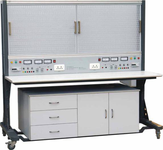 本實(shí)訓(xùn)臺(tái)由實(shí)訓(xùn)屏(內(nèi)置電源)、實(shí)訓(xùn)桌、實(shí)訓(xùn)儲(chǔ)物柜三大部分組成。以30mm×30mm成型方鋼作為設(shè)備主要框架材料;實(shí)訓(xùn)屏、地盤采用焊接連接、關(guān)鍵部位采用三角筋用內(nèi)六角螺釘加固連接,表面經(jīng)高溫噴塑處理,美觀大方且有效起到防銹絕緣的作用;由兩條35mm×35mm鋁合金型材及滑槽組成網(wǎng)孔板固定機(jī)構(gòu);固定機(jī)構(gòu)的下方是鐵制雙工位電源箱,每工位電源箱的布局依次為電源保護(hù)裝置、電源指示裝置、電源輸出;實(shí)訓(xùn)桌桌面采用25mm麻灰色高密度層壓板封邊特制,有效提高絕緣等級(jí);實(shí)驗(yàn)桌底部裝有至少4個(gè)導(dǎo)向輪,方便實(shí)訓(xùn)臺(tái)架移動(dòng);