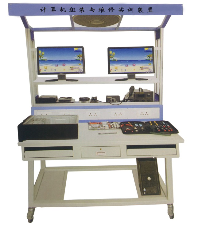 工作臺要求采用雙工位結構設計,采用工業鋁合金型材框架,共兩層,其中第一層可放置維修工具、套件、儀器儀表;第二層可放顯示器,頂部設有30W日光燈一盞和風扇一臺。實訓臺設有一個抽屜、兩個鍵盤托架、兩個主機柜,下方設有四個剎車的萬向輪。