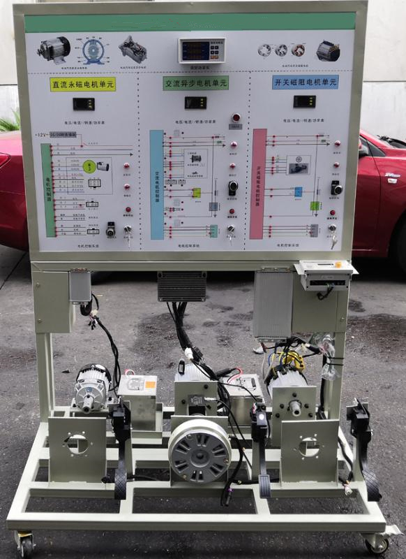 電機性能試驗臺由實訓臺架、新能源汽車電池組、三種新能源汽車常用電機(直流永磁、交流異步、開關磁阻)、三種新能源汽車配套電機控制器、加速踏板、檔位器、數顯電壓電流表、轉速表、扭矩表、功率表、臺式機電腦(外配套)等模塊組成。