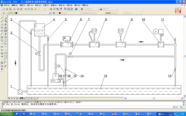 7.比例調節閥; 8. 渦街流量計; 9. 渦輪流量計; 10. 孔板流量計; 11. 放氣閥; 13. 水槽;