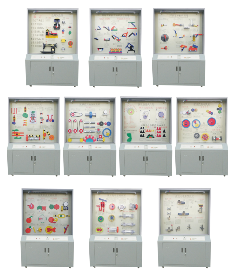 根據全國技工學校機械類通用教材《機械基礎》示教陳列柜是一套電化教學設備。本陳列柜共分十個柜,陳列柜通過機械模型或實物,配合相應的圖文資料,形象地展示與解說機械基礎的基本知識,加強學生對通用機械基礎的類型、結構特點及其設計的感性認知,為進一步學習機械基礎奠定基礎。
